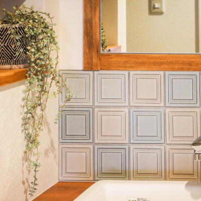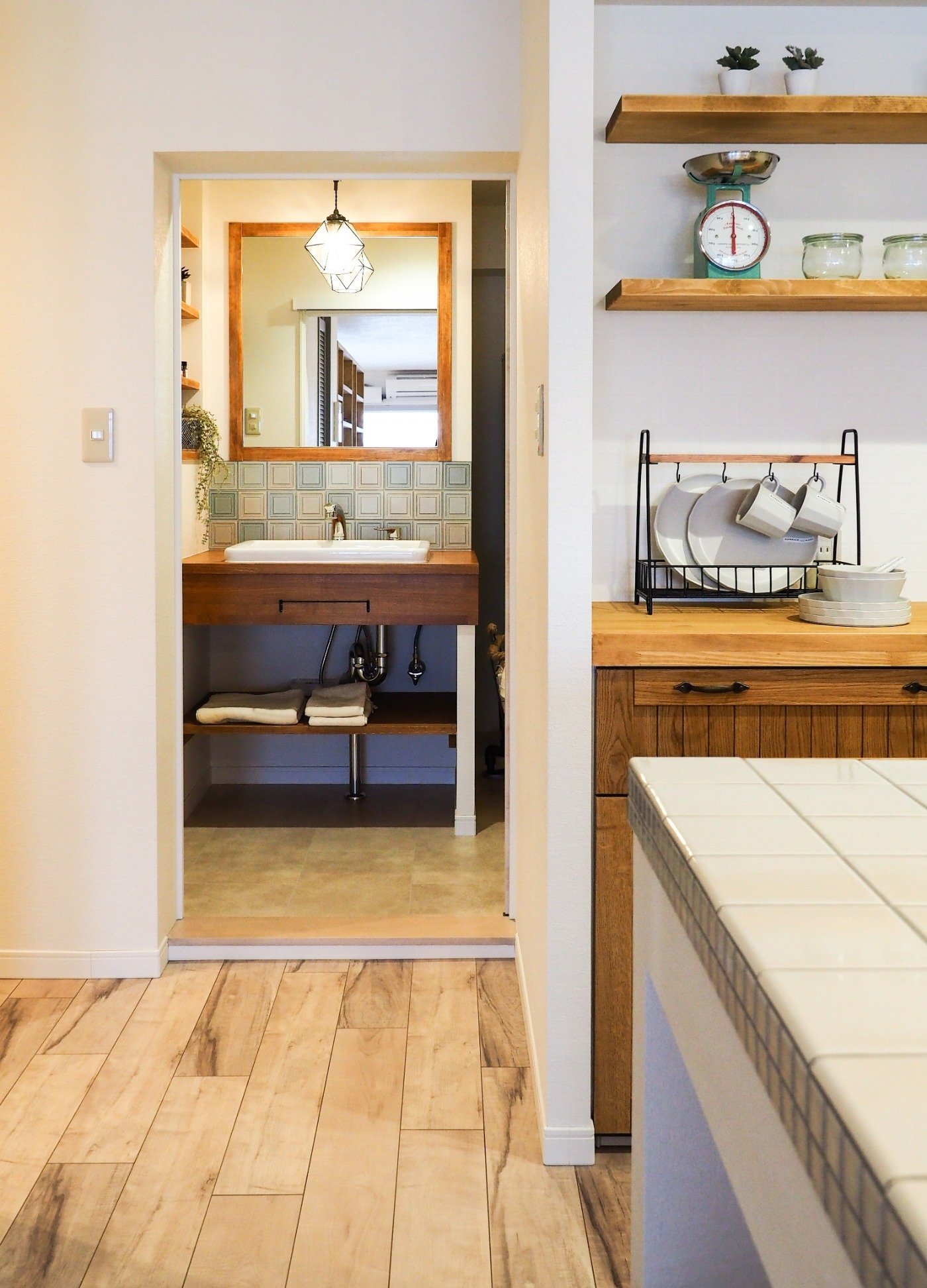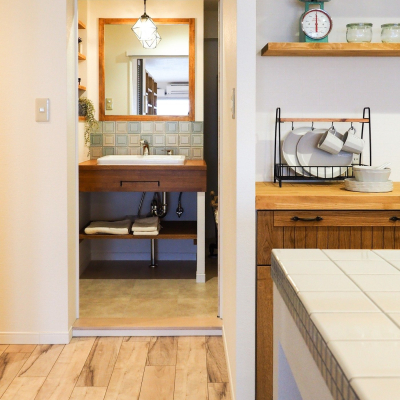 ナチュリエオリジナルの洗面台は、マットな質感のタイルを採用